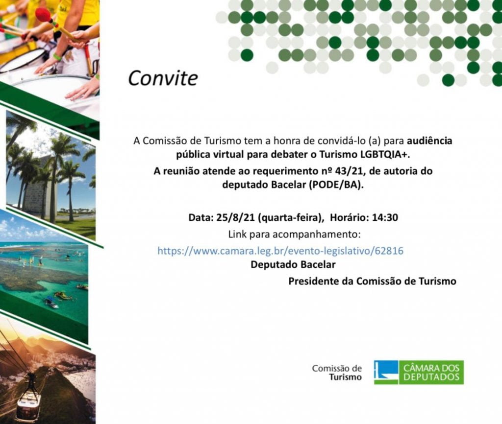 O requerimento para o debate foi apresentando pelo Presidente da Comissão, o deputado João Carlos Bacelar (PODE – BA). Foram convidados Ricardo Gomes, Presidente da Câmara LGBT; Otavio Furtado, Coordenador Nacional Adjunto de Turismo da Aliança Nacional LGBTI+; e Clóvis Casemiro, representante da IGLTA. Também foram convidados representantes do Ministério do Turismo e da Embratur.