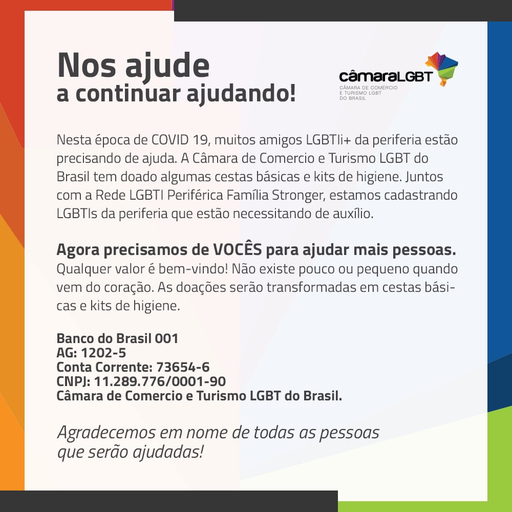 “Nós da Câmara LGBT não poderíamos nos furtar de contribuir com quem necessita. Sabemos que o momento é difícil para todos nós, no entanto muitos dos LGBTI+ da periferia estão mais precisados. Agradecemos qualquer contribuição nesse momento que vai nos ajudar muito”, disse Ricardo Gomes, presidente da Câmara de Comércio e Turismo LGBT do Brasil.