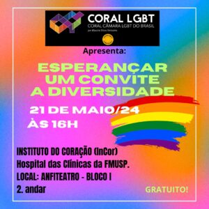 O Coral Câmara LGBT+ do Brasil, conhecido por sua atuação em prol da diversidade e inclusão, foi convidado para participar do evento “DIVERSIDADE EM FOCO: Promovendo a Inclusão Participativa Hospitalar”. Organizado pelo InCor (Instituto do Coração) – Diversidade e Inclusão, da Faculdade de Medicina da USP, a apresentação ocorrerá no dia 21 de maio de 2024, às 16h, no anfiteatro localizado no 2º andar do Bloco 1 do instituto. Para mais informações sobre o evento, acesse: https://audiovisualincor.wixsite.com/diversidadeemfoco
