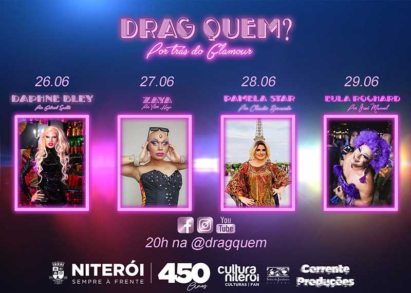 Dia 26 a história de Gabriel Spelta e sua Daphne Bley, será conhecida do público. No dia 27 é a vez de Victor Hugo contar como nasceu e vive Zaya. No dia 28 Claudio Bernardo compartilha suas experiências na arte drag como Pamela Star. Encerrando a temporada de Drag Quem – Por Trás do Glamour, dia 29, é a vez de José Manoel contar sua experiência como Eula Rochard.