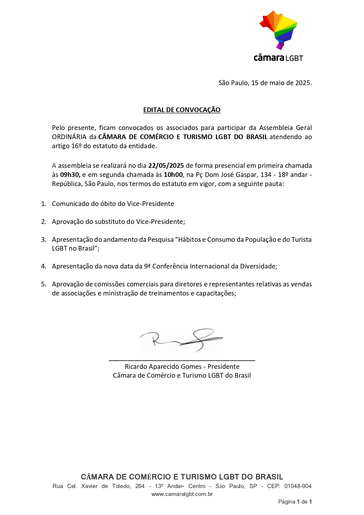 Pelo presente, ficam convocados os associados para participar da Assembleia Geral ORDINÁRIA da CÂMARA DE COMÉRCIO E TURISMO LGBT DO BRASIL atendendo ao artigo 16º do estatuto da entidade.