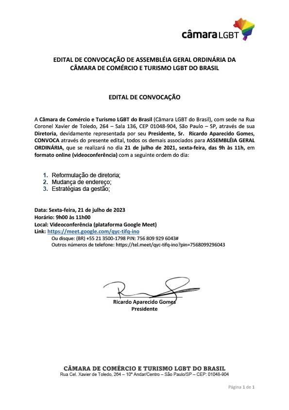 A Câmara de Comércio e Turismo LGBT do Brasil (Câmara LGBT do Brasil), com sede na Rua Coronel Xavier de Toledo, 264 – Sala 136, CEP 01048-904, São Paulo – SP, através de sua Diretoria, devidamente representada por seu Presidente, Sr. Ricardo Aparecido Gomes, CONVOCA através do presente edital, todos os demais associados para ASSEMBLÉIA GERAL ORDINÁRIA, que se realizará no dia 21 de julho de 2021, sexta-feira, das 9h às 11h, em formato online (videoconferência) com a seguinte ordem do dia: