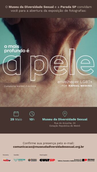 O Museu da Diversidade Sexual (MDS), instituição da Secretaria da Cultura, Economia e Indústria Criativas, lança no dia 29 de maio a exposição O mais profundo é a pele, com fotografias de Rafael Medina e curadoria de André Fischer, em parceria com a ParadaSP, organizada pela APOLGBT-SP (Associação da Parada do Orgulho LGBT de São Paulo). A exibição celebra o envelhecer LGBT+ por meio de fotografias de pessoas da comunidade com mais de 60 anos. O lançamento da exposição, às vésperas do Mês do Orgulho, também marca um ano da reinauguração do museu, que hoje conta com 540m² e mais de 100 obras. A exposição poderá ser visitada gratuitamente a partir de 30 de maio (sexta-feira), de terça a domingo, das 10h às 18h, com ingressos disponíveis na plataforma Sympla.