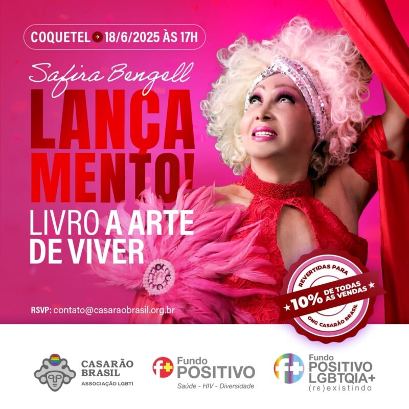 Como parte das celebrações do Mês do Orgulho LGBTQIA+, o Casarão Brasil – Associação LGBTI lança a biografia “A Arte de Viver”, que conta a trajetória da atriz transformista, produtora cultural e escritora Safira Bengell, reconhecida como a “Dama da Diversidade Cultural Brasileira”. O livro, escrito pelo jornalista Enéas Barros, será lançado no dia 18 de junho (quarta-feira), às 17h, na sede da instituição, com um coquetel de lançamento. As vagas são limitadas, e as reservas devem ser feitas pelo e-mail [email protected].