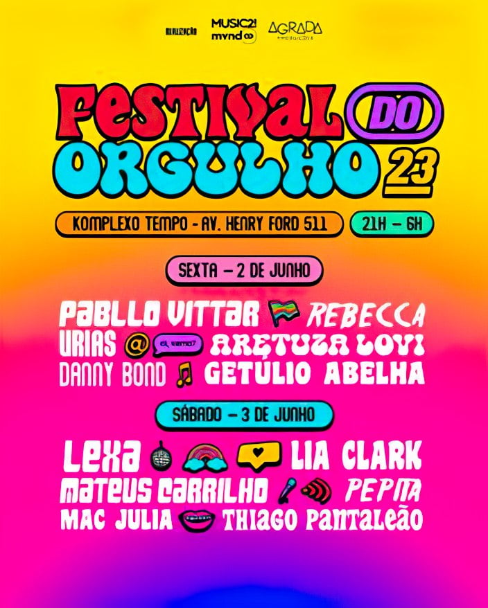 O line-up da segunda edição presencial do Festival do Orgulho, que acontece nos dias 2 e 3 de junho, já foi anunciado. O festival será realizado no Komplexo Tempo, localizado na Vila Industrial da Mooca, em São Paulo. Na sexta-feira, dia 2 de junho, Pabllo Vittar, Urias, Rebecca, Danny Bond, Aretuza Lovi e Getúlio Abelha serão os destaques da noite. Enquanto isso, no sábado, dia 3, Lexa, Thiago Pantaleão, Mateus Carrilho, Mac Júlia, Pepita e Lia Clark vão animar o público com suas performances, que ocorrerão das 21h às 6h. O festival é promovido pela Mynd em parceria com a Agrada Produções.