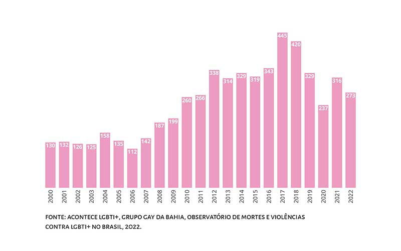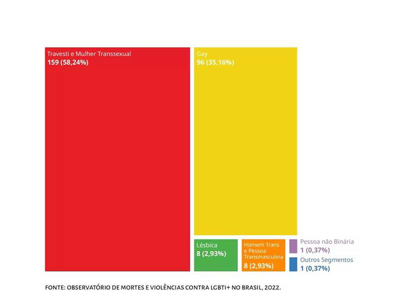 Um novo relatório divulgado ontem (11), pelo Observatório de Mortes e Violências contra LGBTI+ aponta que, somente em 2022, foram registradas 273 mortes violentas de pessoas LGBTQIA+ no Brasil. Desse total, 228 foram assassinatos, 30 suicídios e 15 outras causas. O estudo foi elaborado por meio de uma base de dados compartilhada entre a Acontece – Arte e Política LGBTI+, ANTRA – Associação Nacional de Travestis e Transexuais e a ABGLT – Associação Brasileira de Lésbicas, Gays, Bissexuais, Travestis, Transexuais e Intersexos, que contém os registros de casos ocorridos em jornais, portais eletrônicos e redes sociais.